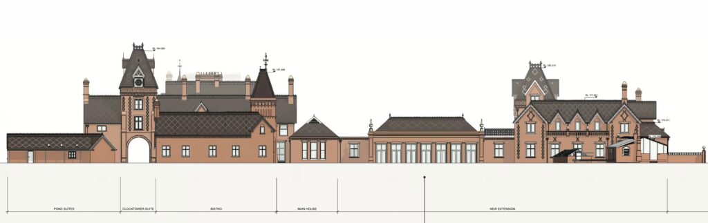 It is also proposed that the Bistro support kitchen basement is pulled back, reducing the extent of underpinning towards the base of the Clock Tower. A new bakery and reconfigured plant room are proposed beneath the footprint of the former 1960s school accommodation, located to the south of the Rayners House Extension and away from the historic garden buildings.